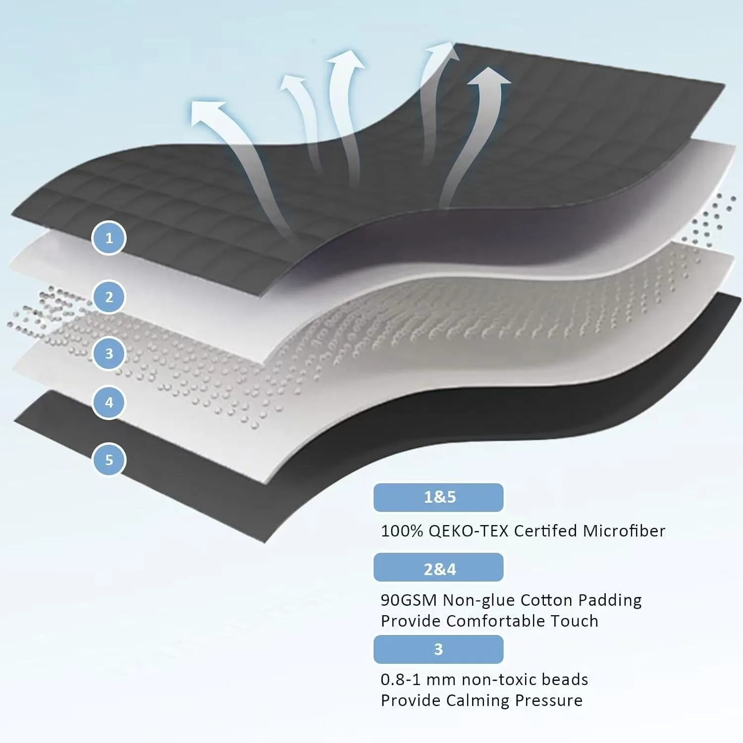 A carefully engineered multi-layer design includes evenly distributed glass beads secured with anti-shift stitching. This ensures balanced pressure across the body, preventing clumping and maintaining a steady, calming effect throughout use.